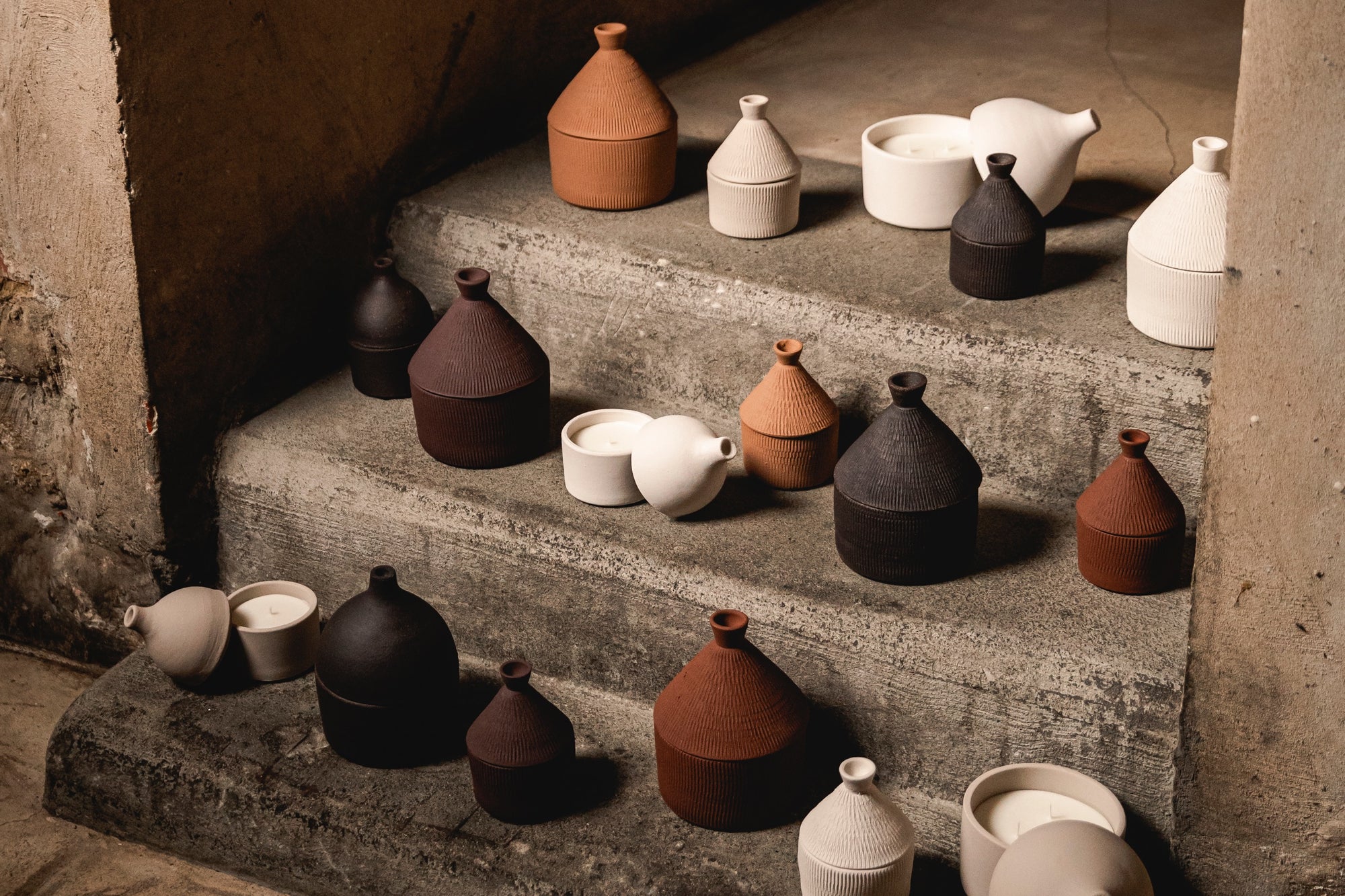 Kaarsen zijn niet de enige textuur waarin je van onze geuren kan genieten. Met onze diffusers krijg je dezelfde sensorische verwennerij, maar in een lichtjes anders concept. Opnieuw werkten we hier met een tajinevorm voor Tenderness en een koepelvariant voor Nostalgia, terwijl taupe en beige de respectievelijke kleuren bleven. Uiteraard wilden we geen doorsnee product op de markt brengen, dus besloten we in plaats van de gebruikelijke rechte stokjes te opteren voor een kronkelige, meer organische soort. Daardoor krijgen de diffusers tegelijkertijd een interessantere look en zijn ze los van de geur die ze verspreiden een geslaagde toevoeging aan je thuis. Opnieuw zijn de houders van keramiek en handgemaakt. Bijkomend voordeel is dat je ze blijvend kan hervullen. Voor jezelf of als cadeau voor een ander: ervaar een rijke oase die het Imagicasa-gevoel een nieuwe dimensie geeft.